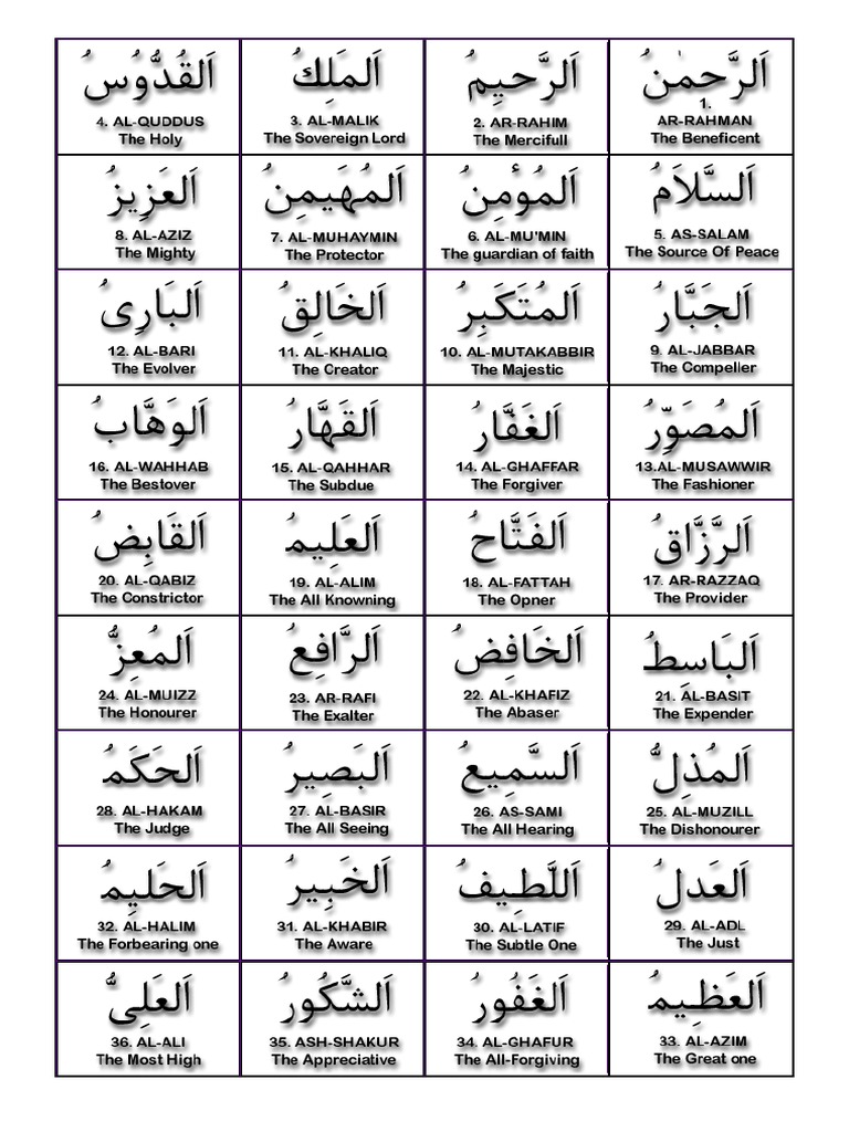 Asmaul husna bisa dibaca ketika selesai shalat atau dibaca di saat tertentu. 8 www.understandquran.com allah allah mentions himself by his name allah on 2699 occasions in the quran. The 99 names contained here have secret powers hidden in their meaning and they reflect the various attributes of master of the worlds. 99 names of allah (al asma ul husna) the first pillar of imaan (faith) in islam is belief in allah. Really enjoy hear this one.